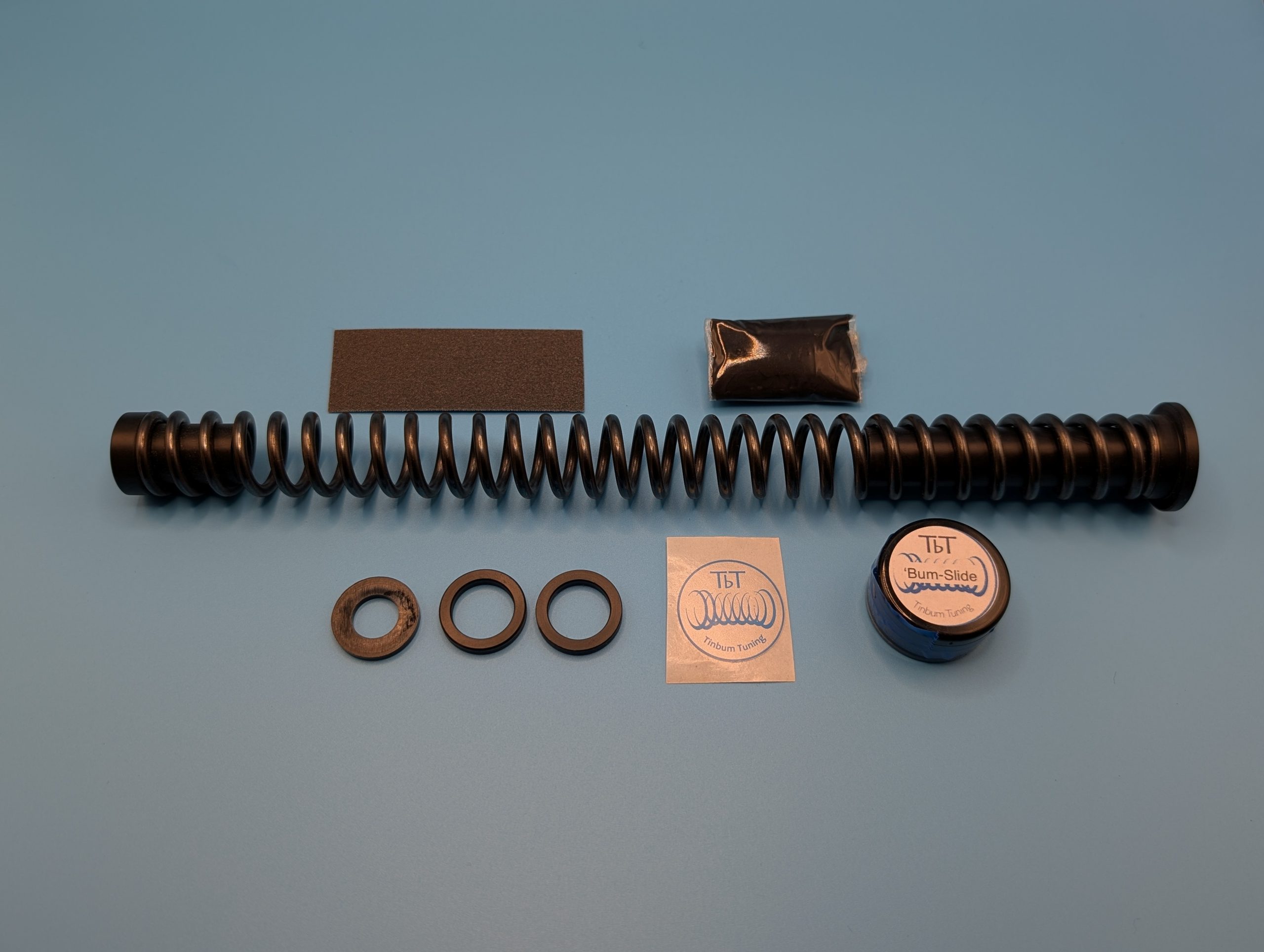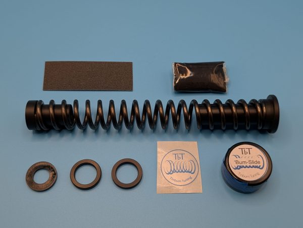 All the benefits of a standard TbT kit, but custom fitted to the supplied Premium TbT Spring. Comes with fitted delrin spring guide with a top hat, slip washer and 2 preload washers. This kit also comes with a pot of Bum-Slide hi moly paste,Lithium based Molybdenum Disulphide grease and abrasive paper as well as instructions for fitting kit and piston sleeve.