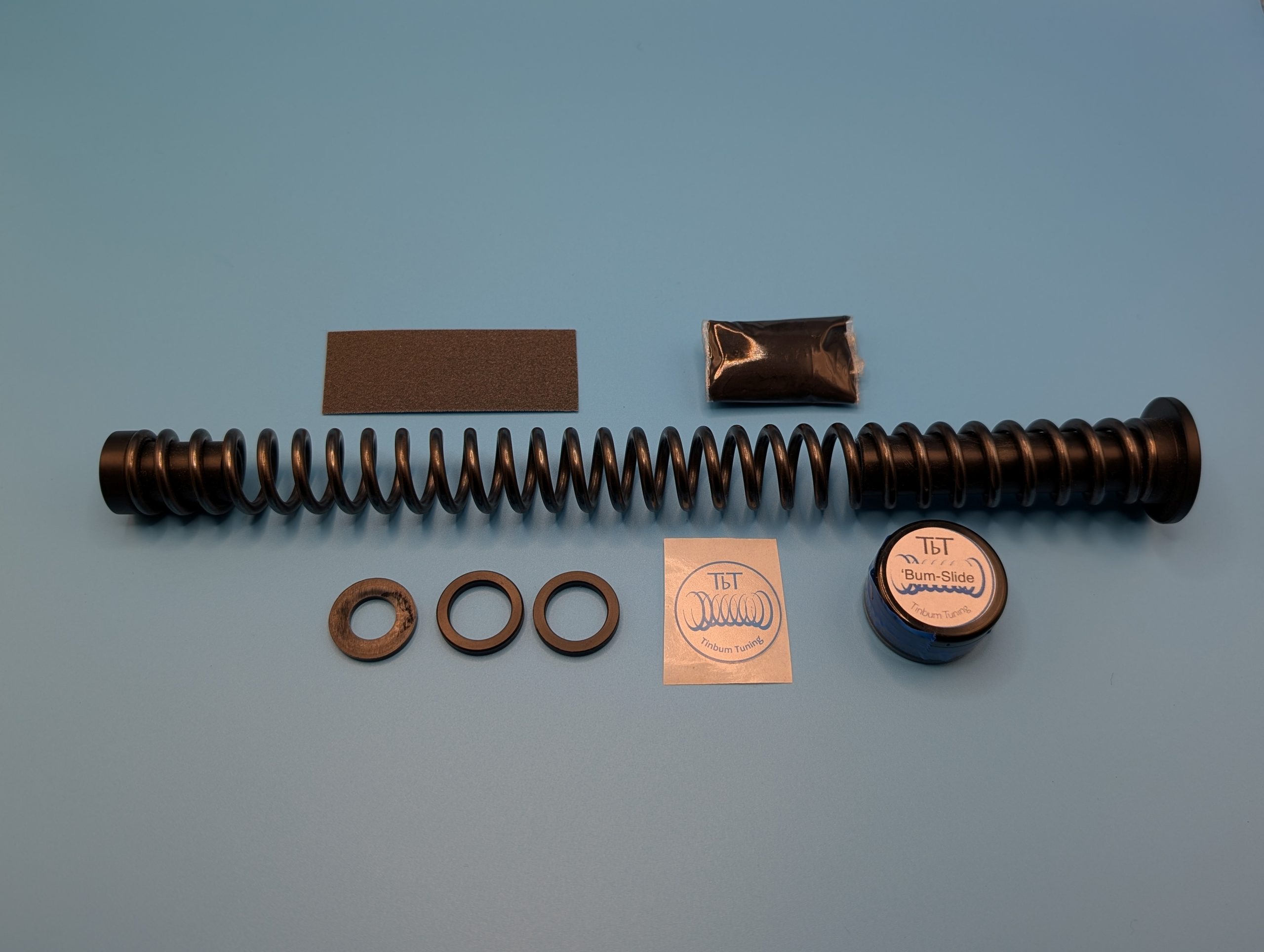 The kit includes a short stroke extension to reduce lock time and hold sensitivity, one of our new 29 coil TbT Premium Springs with fitted guides, and a pot of Bum-Slide hi moly paste.